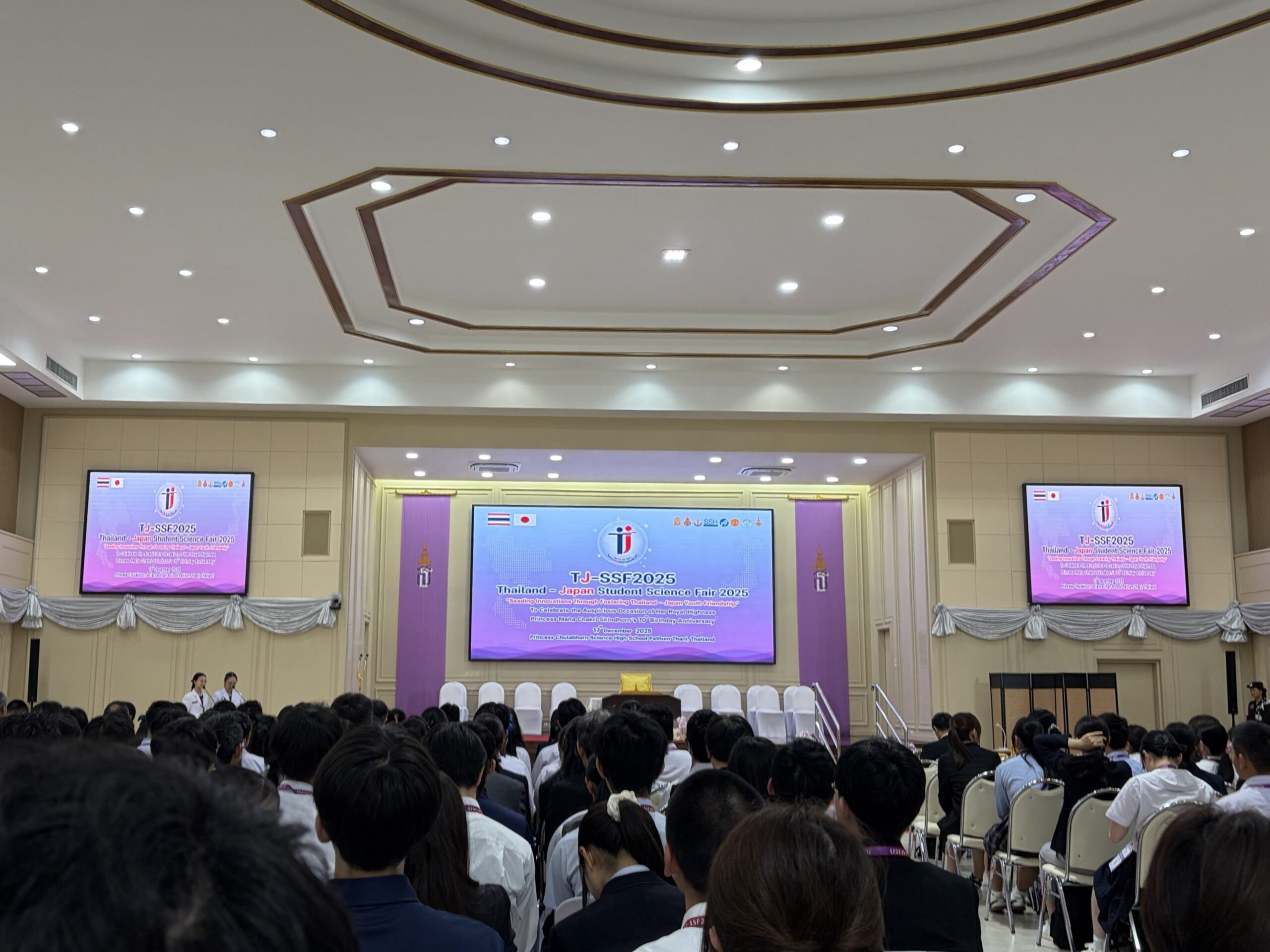サイエンスフェア(Thailand-Japan Student Science Fair 2025)開会式が行われ、マハ・チャクリ王女殿下もご参加されました。開会式の後はポスターセッションが行われ、研修の成果を英語で発表しました。参加者同士で活発な質疑応答が行われ、交流を深めることができました。