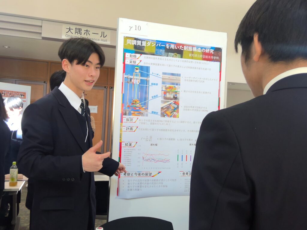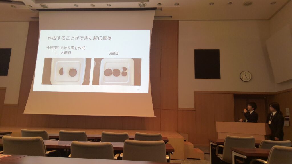 ポスター発表では、実際に製作した椅子やインクで実験を再現する等、分かりやすい発表となるように工夫しました。また、探究コースの生徒は「磁力で飛行しようpart1超伝導体生成編」というテーマで口頭発表を行い、アドバイスを頂きました。